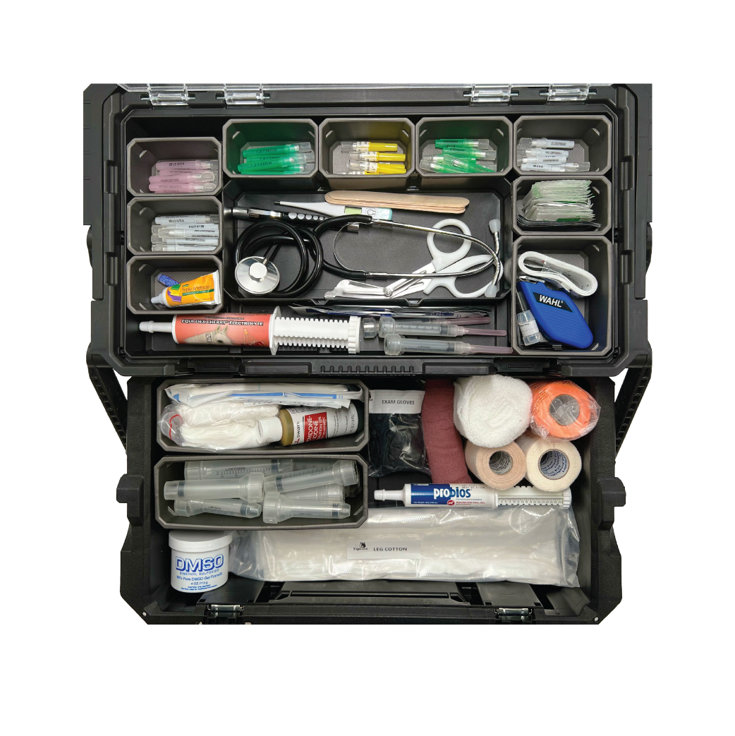 Be prepared for any equine emergency with The Professional Rx Equine First Aid Box. This essential kit comes with an articulated plastic first aid box and contains a mix of wound treatment and medical products to triage emergencies with your horse in the barn or while traveling.